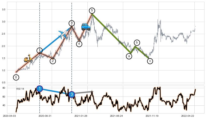 ➢ 第一, 三驱动浪端点:【RSI】走势出现【常规背离 & 反转信号】背离程度53.94%,背离夹角角度108.1˚,背离程度中等