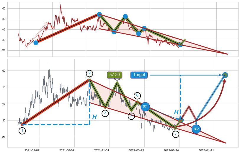 ➢ 降楔型:猜想临近关键阻力位突破点 → 临近拐点上涨 → 机会信号 → 大趋势均值回复