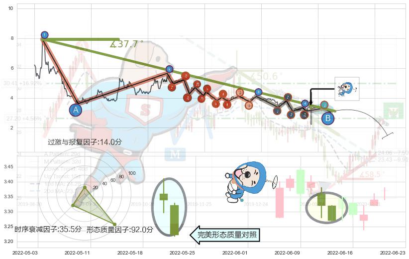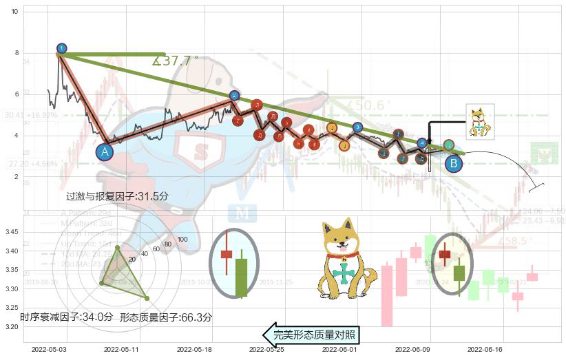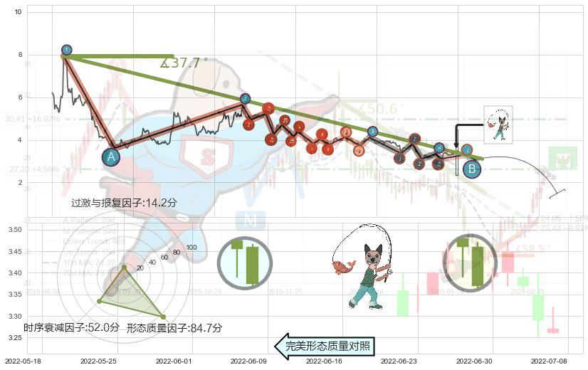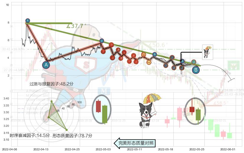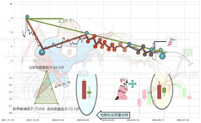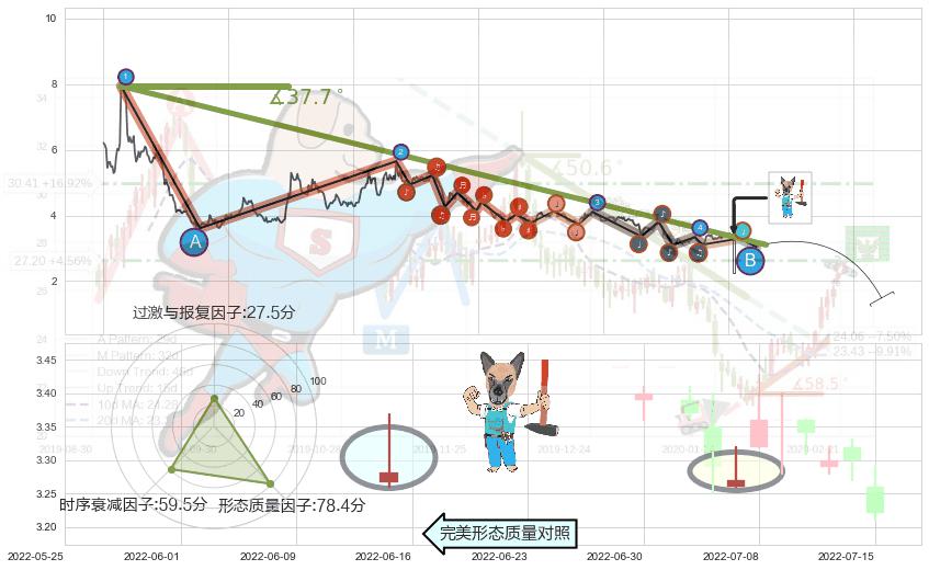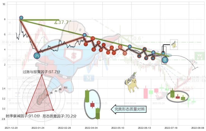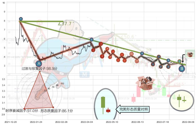 从2020-07-09至2022-08-12,共包含517个交易日,阶段股价下跌-77.96%,阶段股价变动位移路程比: 1 : 11,下跌趋势角度: 37.7