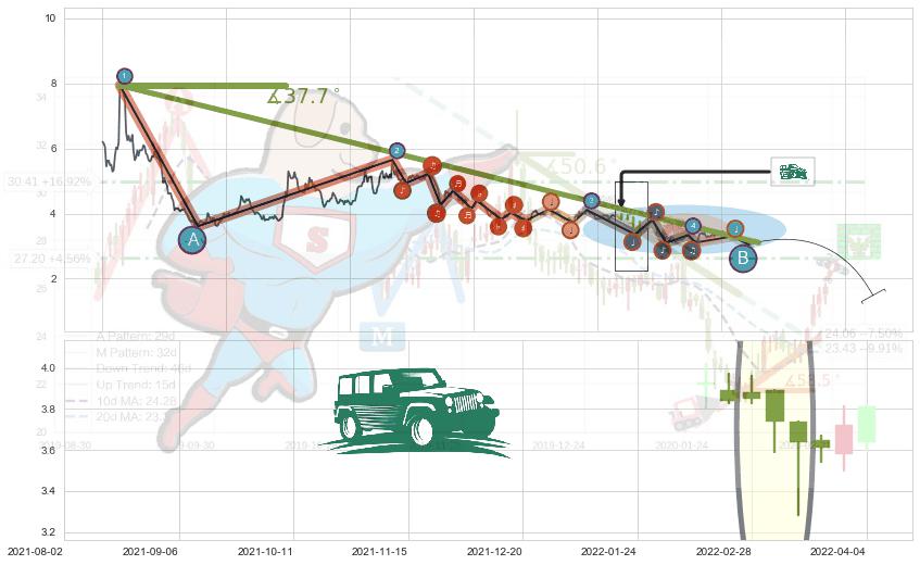 ➢ 🕰 价格走势在2022-02-21至2022-03-21期间形成高档五阴线,残存影响值:-3.60