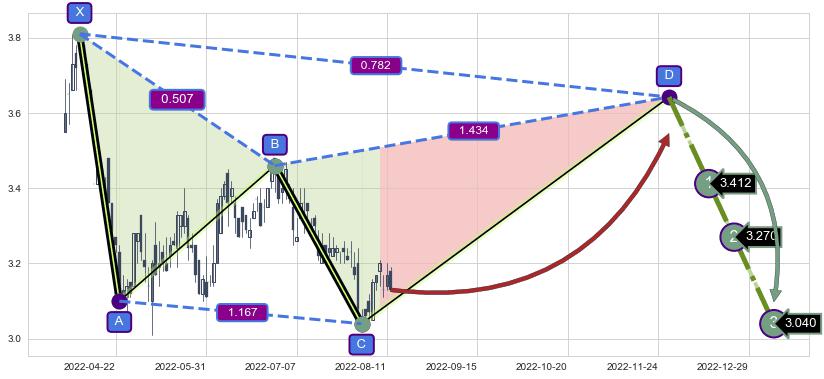 ➣ D点拟合预测价格3.642,距离最后交易收盘价格3.130相差 +16.36%