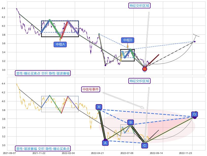 ➢ 【中枢A】:2021-11-11-2022-02-14,中枢由5笔构成,共64交易日, ZG=4.11, ZD=3.850