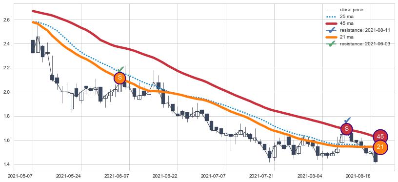 📝 多条均线形成死叉后走势最低价格达到: 0.7800