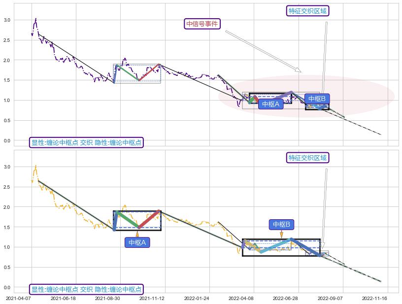 ➣ 缠论中枢点:猜想破位中枢B后持续下拉 → 下跌 → 破位中枢B支撑 → 持续趋势跟踪