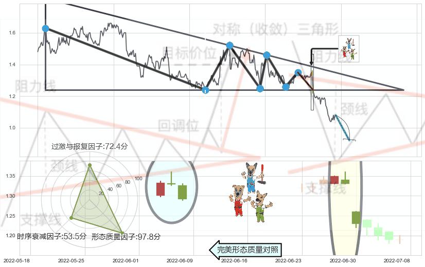 ➢ 【卖1】: 激进型 卖点→(2022-06-30: 1.2400 )形成突破下降三角形整理【整理】形态