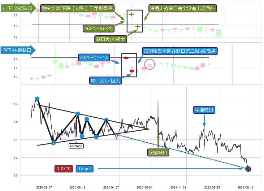 ➣ 普通缺口在【下降【对称】三角形整理】震荡整理形态中出现