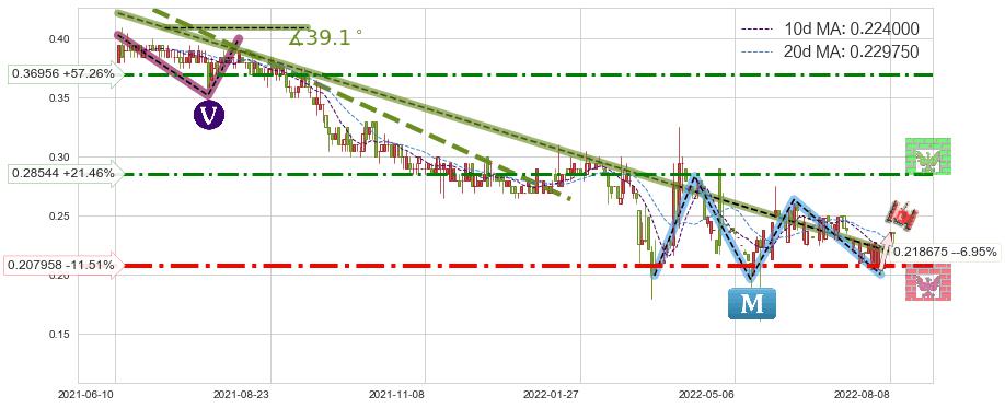 ♘ 阻力价格位0.36956,可信任强度62.53%,距离最后交易2022-08-10形成的收盘价格0.235000相差 +57.26%