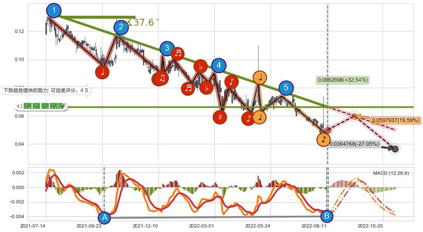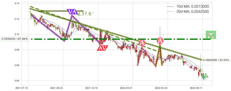 ♘ 在最后的下跌阶段2021-07-19至2022-08-12,存在 持续未破位的阻力位 ,阻力价格0.0662698,可信任强度88.58%,其距离最后价格0.0500000相差 +32.54%