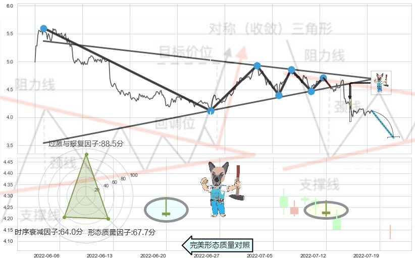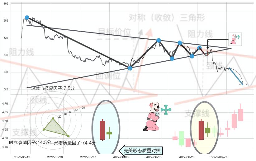 ➣ 【多空双方观望→争持→促使价格波动日益狭窄→空方打破攻守平衡点】对称三角形中继整理, 已在2022-06-13突破【支撑】颈线 4.54 →演变成下降通道