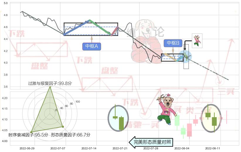 ➣ 【中枢B】:2022-07-22-2022-08-08,中枢由4笔构成,共12交易日, ZG=4.11, ZD=4.09