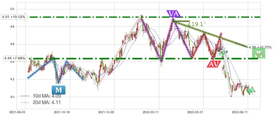 ♘ 阻力价格位4.44,可信任强度86.03%,距离最后交易2022-08-12形成的收盘价格4.12相差 +7.69%