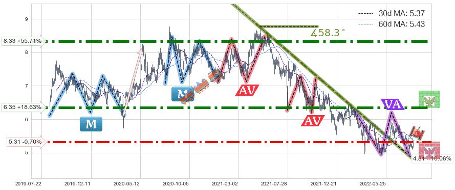 ➣ 【仅预测突破】最后价格:5.35与预测突破价格:5.98→【空间较大】后续最小【反转】第一目标价格→(2022-10-19: 6.97 )