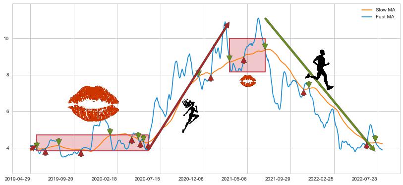 2021-07-07至2022-07-21 慢线与快线呈空头排列, 慢线与快线接触少,无缠绕