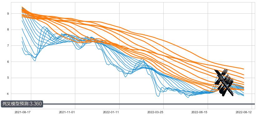 ➣ 60小时均线于(2022-07-18: 4.30)形成【死叉】基于【死叉历史模型】预测死叉后最低波谷价格: 3.007, 死叉后最低价格3.720,尚未达到预测最低波谷价格, 预期继续下跌