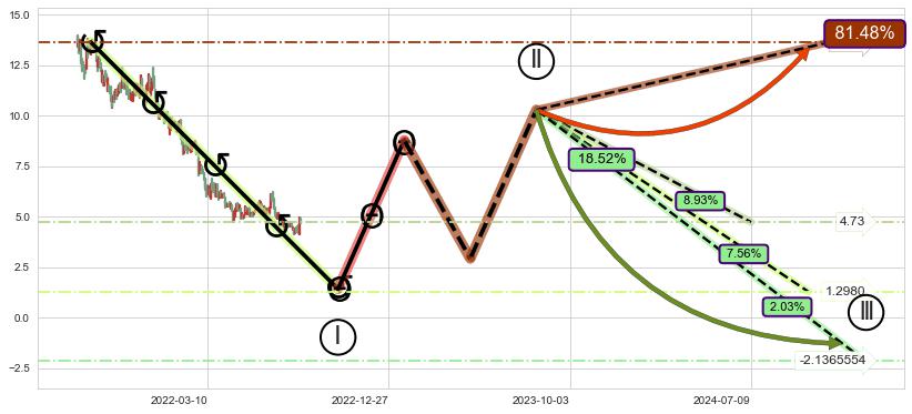 ➣ 波浪理论:猜想即将止跌 → 上涨 →【拐点】浪5临近 → 大趋势均值回复