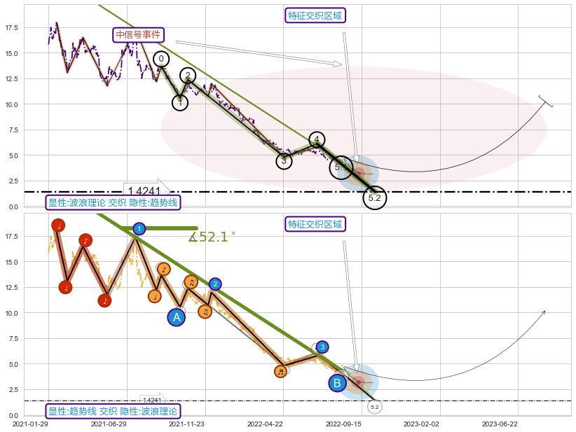 从2021-07-14至2022-06-24,共包含233个交易日,阶段股价下跌-103.30%,阶段股价变动位移路程比: 1 : 5,下跌趋势角度: 47.3