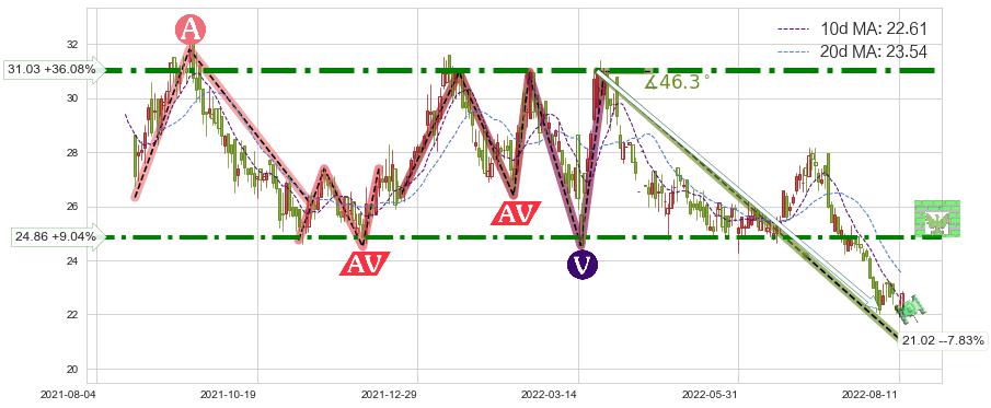 ♞ 10日均线:22.61,20日均线:23.54→ 快线<慢线