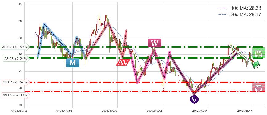 ♘ 阻力价格位32.20,可信任强度90.30%,距离最后交易2022-08-12形成的收盘价格28.35相差 +13.59%