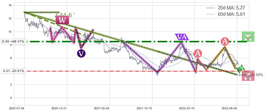 ➣ 2020-07-28-2021-11-05下跌趋势存在反转上涨[机会],其原下跌趋势的阻力位(3.407)已被突破[强支撑信号],原下跌趋势角度: 44.6˚