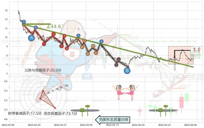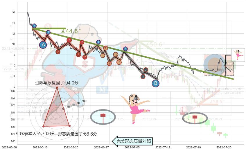 从2020-07-28至2021-11-05,共包含316个交易日,阶段股价下跌-95.49%,阶段股价变动位移路程比: 1 : 7,下跌趋势角度: 44.6