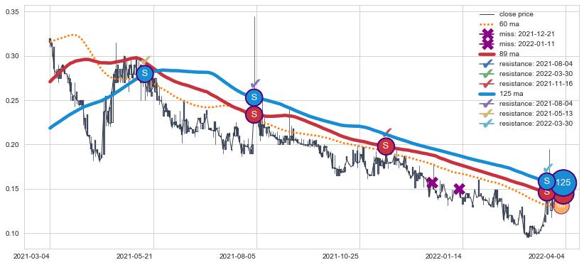 ➣ 125小时均线于(2021-05-11: 0.27704)形成【死叉】基于【死叉历史模型】预测死叉后最低波谷价格: 0.204856, 死叉后最低价格0.0770000,已经下跌超出预测最低波谷价格, 预期反弹