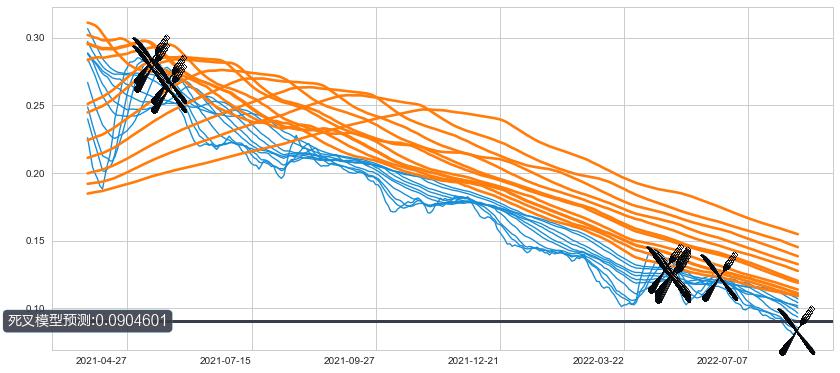 ➣ 30小时均线于(2022-05-05: 0.120967)形成【死叉】基于【死叉历史模型】预测死叉后最低波谷价格: 0.0707827, 死叉后最低价格0.0770000,尚未达到预测最低波谷价格, 预期继续下跌