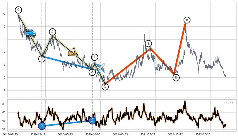 ➢ 第一, 三驱动浪端点:【RSI】走势出现【常规背离 & 反转信号】背离程度59.82%,背离夹角角度61.3˚,背离程度中等