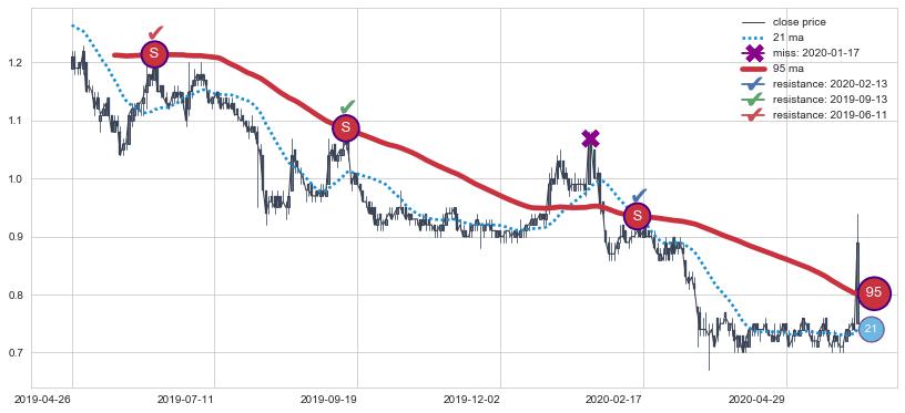 ➣ 95小时均线于(2022-05-26: 0.6886)形成【死叉】基于【死叉历史模型】预测死叉后最低波谷价格: 0.5690, 死叉后最低价格0.5000,已经下跌超出预测最低波谷价格, 预期反弹