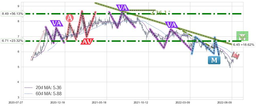 ♘ 阻力价格位6.71,可信任强度92.42%,距离最后交易2022-08-12形成的收盘价格5.44相差 +23.32%