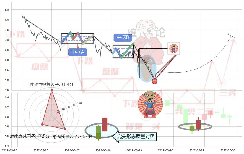 ➣ 【中枢B】:2022-04-20-2022-06-10,中枢由4笔构成,共35交易日, ZG=6.57, ZD=6.30