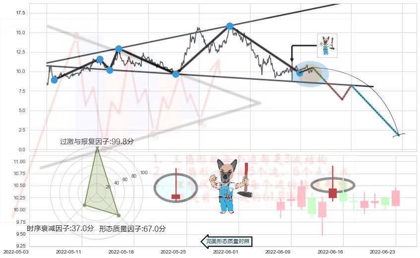 ➢ 看跌(高位倒锤头)流星线 🔜 扩散三角反转临近支撑猜想转换阻力下跌 综合量化分数:42.10 【偏空】