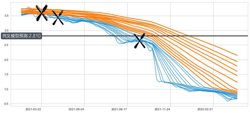 ➣ 60小时均线于(2021-03-22: 3.572)形成【死叉】基于【死叉历史模型】预测死叉后最低波谷价格: 2.913, 死叉后最低价格0.5100,已经下跌超出预测最低波谷价格, 预期反弹