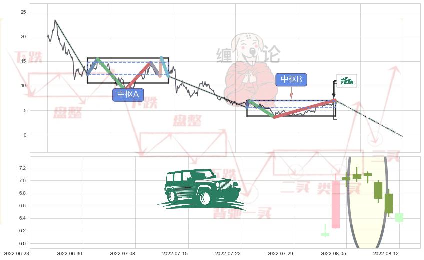 ➢ 【中枢B】:2022-01-07-2022-08-09,中枢由4笔构成,共142交易日, ZG=6.98, ZD=5.56