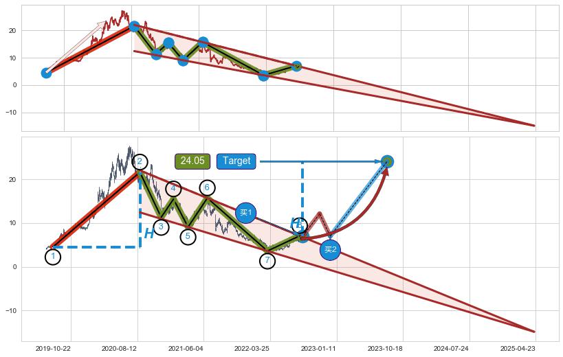 ➢ 降楔型:猜想临近关键阻力位突破点 → 临近拐点上涨 → 机会信号 → 大趋势均值回复