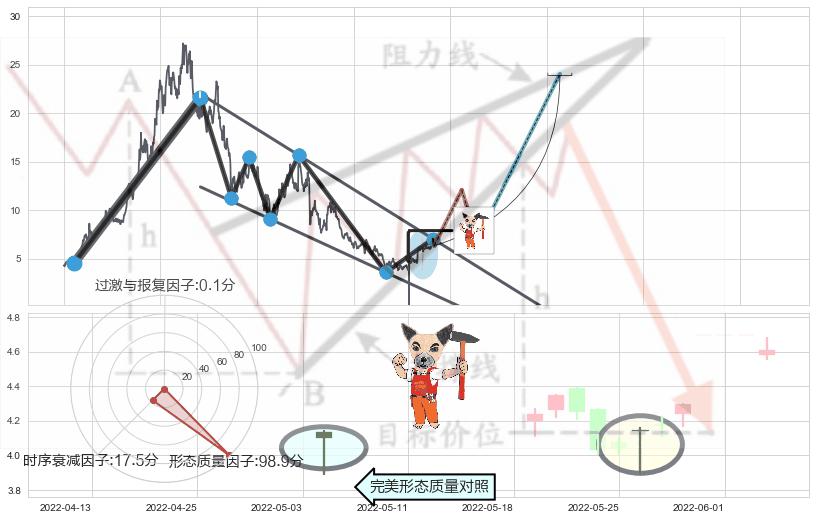 ➢ 锤头线(锤子线) + 降楔型临近阻力猜想转换支撑上涨信号叠加后【反向回撤率】极低,【看多】信号叠加【存续影响极大】