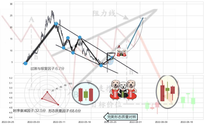 ➣ 锤头线(锤子线) + 降楔型临近阻力猜想转换支撑上涨信号叠加后【目标达成率】低,【看多】信号叠加【存续影响大】