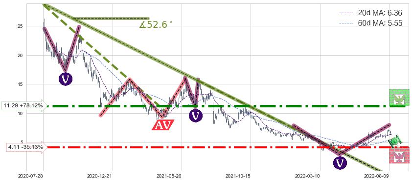 ♘ 支撑价格位4.11,可信任强度72.30%,距离最后交易2022-08-12形成的收盘价格6.34相差 -35.13%