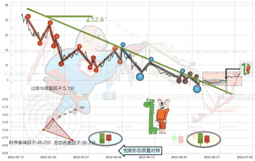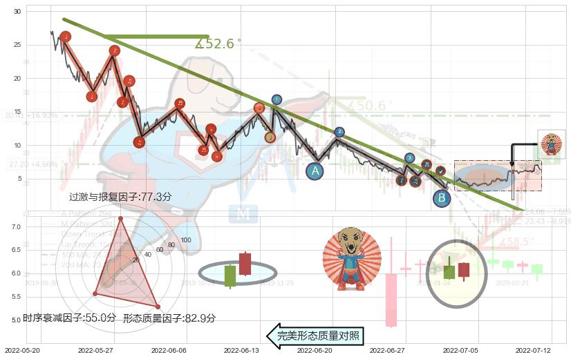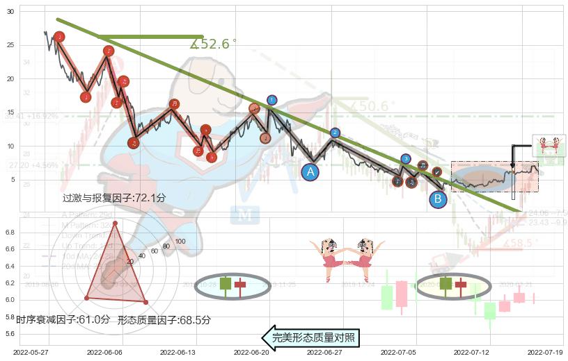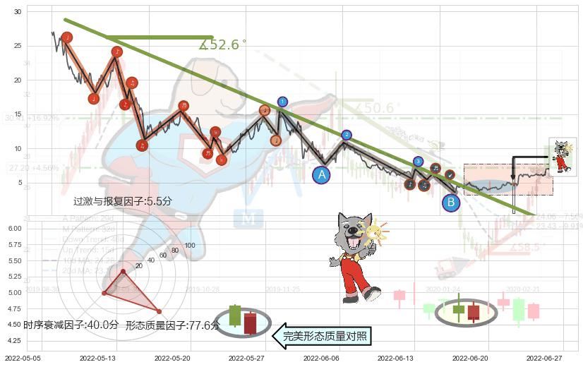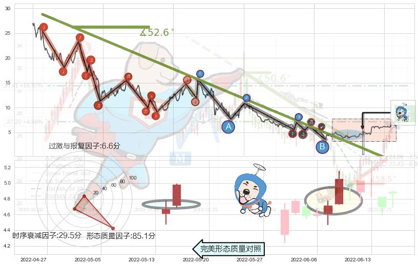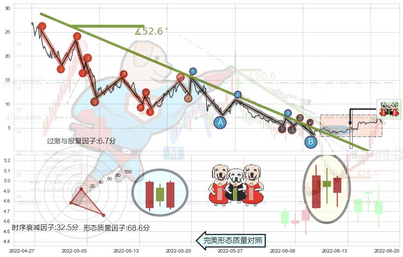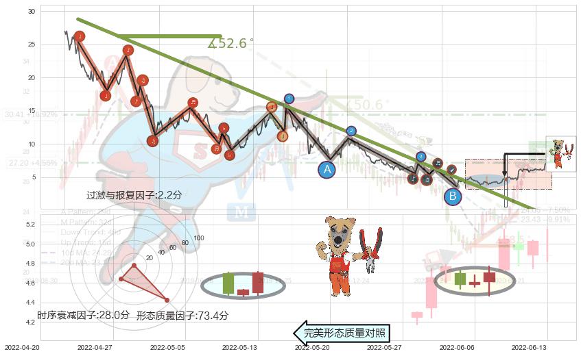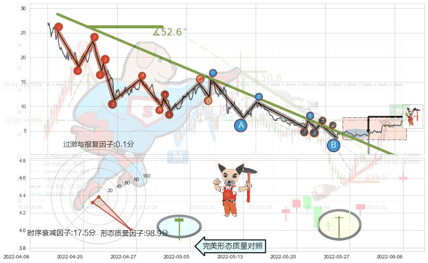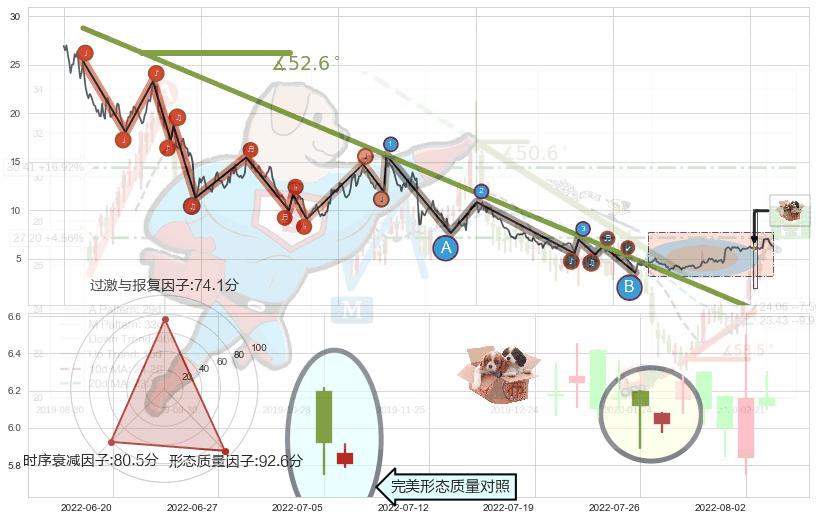 从2021-06-22至2022-04-04,共包含196个交易日,阶段股价下跌-92.92%,阶段股价变动位移路程比: 1 : 7,下跌趋势角度: 52.4