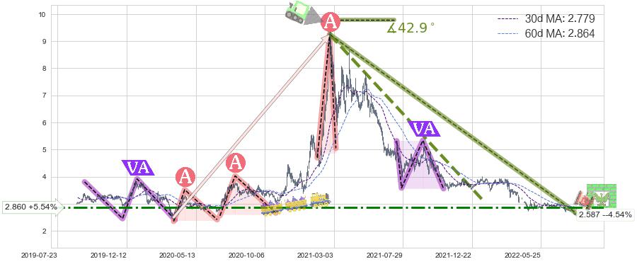 ♘ 阻力价格位2.860,可信任强度68.86%,距离最后交易2022-08-12形成的收盘价格2.710相差 +5.54%