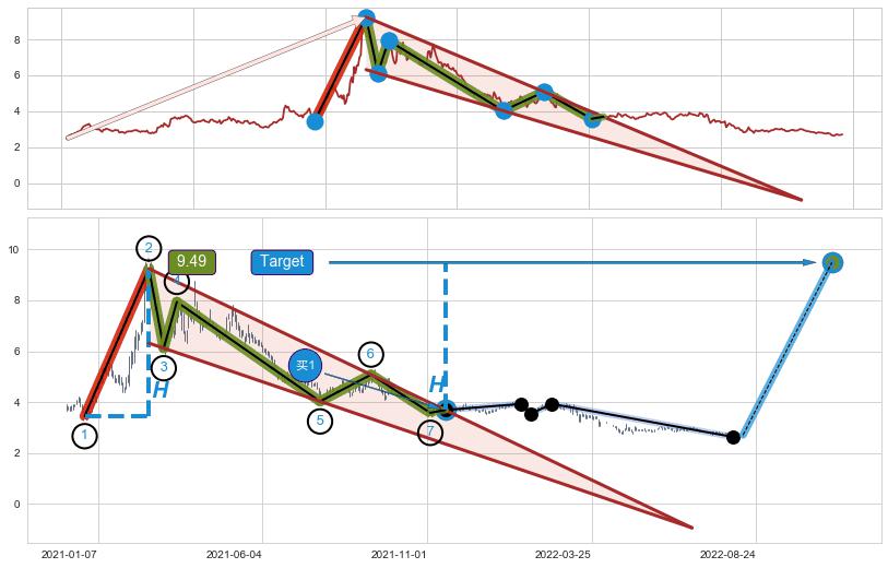 ➢ 最小中继整理涨幅→𝐇: 5.80 (𝐇楔型旗杆的长度:楔型起点→顶点)