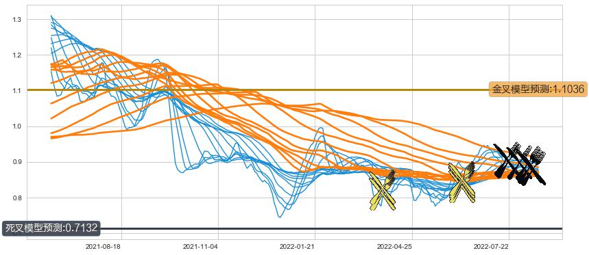 ➣ 55小时均线于(2022-08-09: 0.8782)形成【死叉】基于【死叉历史模型】预测死叉后最低波谷价格: 0.6849, 死叉后最低价格0.8500,尚未达到预测最低波谷价格, 预期继续下跌