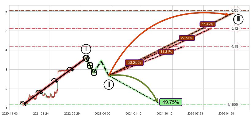 ➢ 大趋势走坏(跌破5浪起点位置)概率49.75%