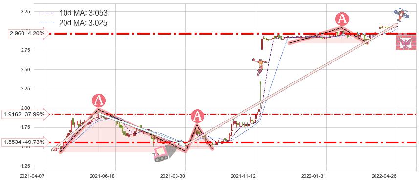 ♘ 支撑价格位2.960,可信任强度75.48%,距离最后交易2022-04-27形成的收盘价格3.090相差 -4.20%
