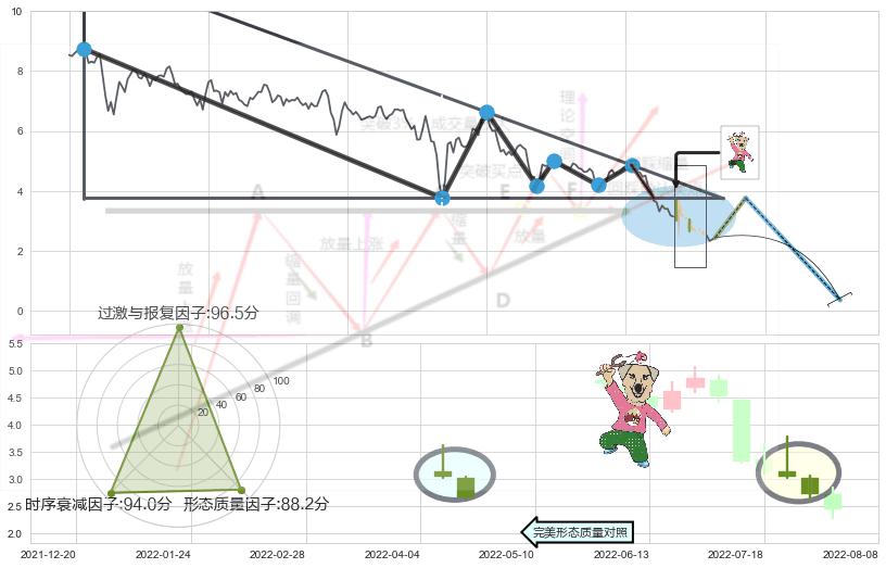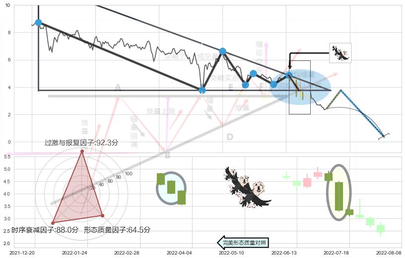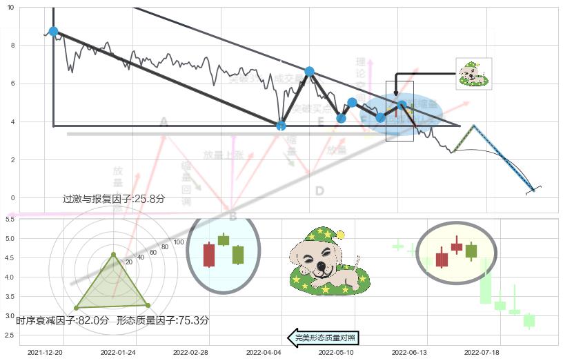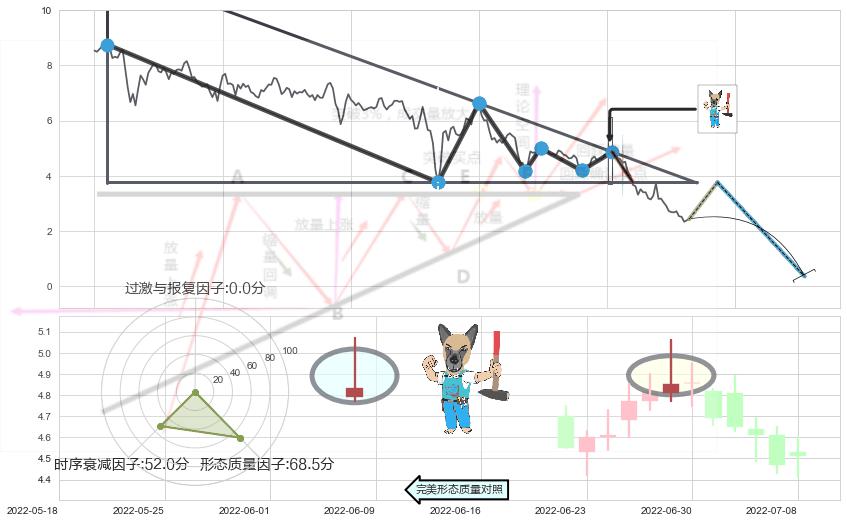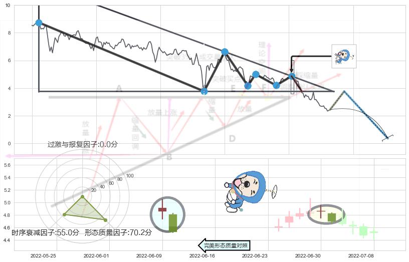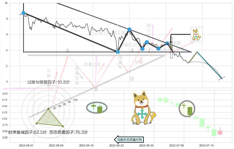 ➢ 【多方力量耗尽,空方打破攻守平衡点】下降三角形中继整理, 已在2022-07-13突破【支撑】颈线 3.760 →演变成下降通道