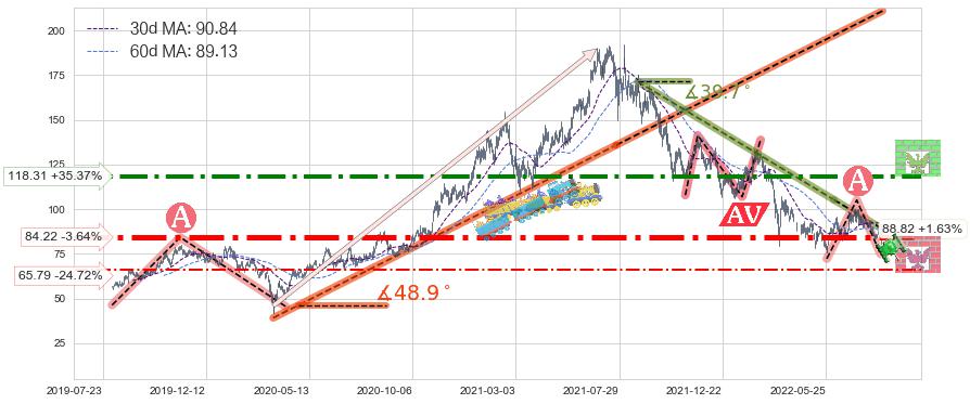 ♘ 支撑价格位84.22,可信任强度88.85%,距离最后交易2022-08-12形成的收盘价格87.40相差 -3.64%