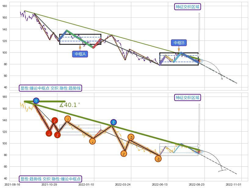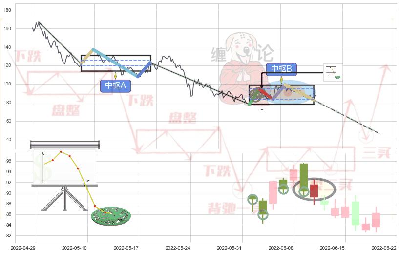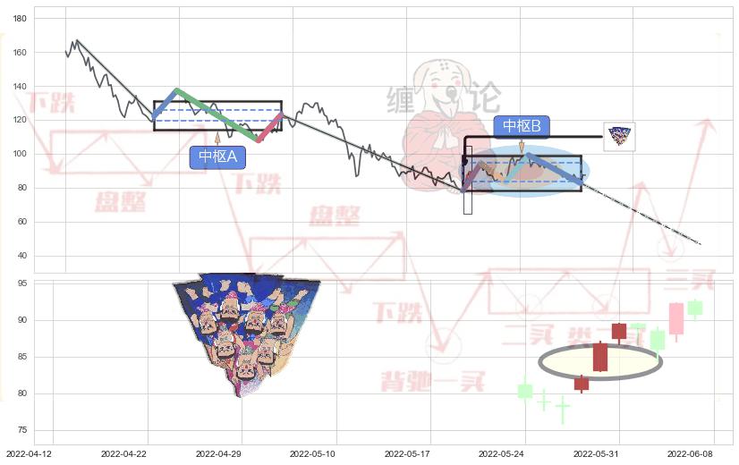 ➣ 【中枢B】:2022-05-26-2022-08-10,中枢由5笔构成,共53交易日, ZG=94.45, ZD=83.40