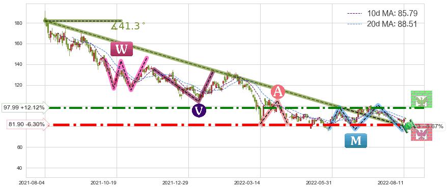♘ 支撑价格位81.90,可信任强度93.77%,距离最后交易2022-08-12形成的收盘价格87.40相差 -6.30%