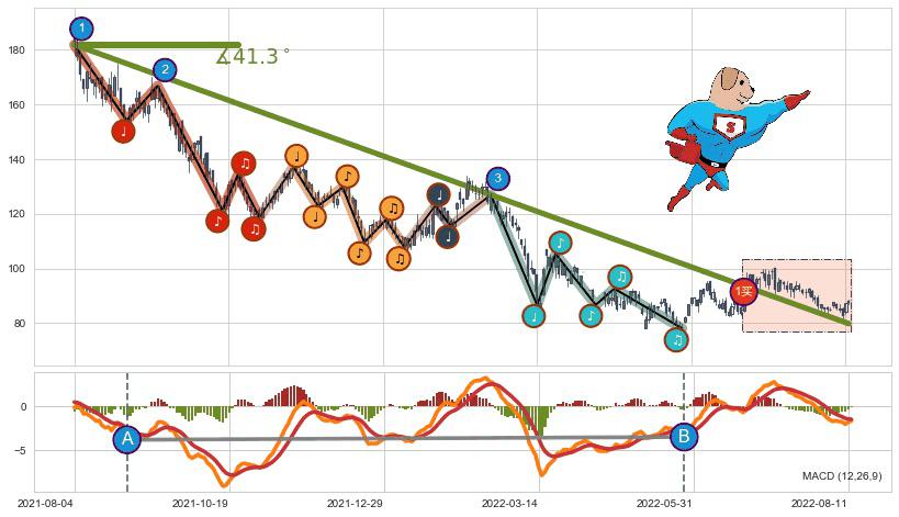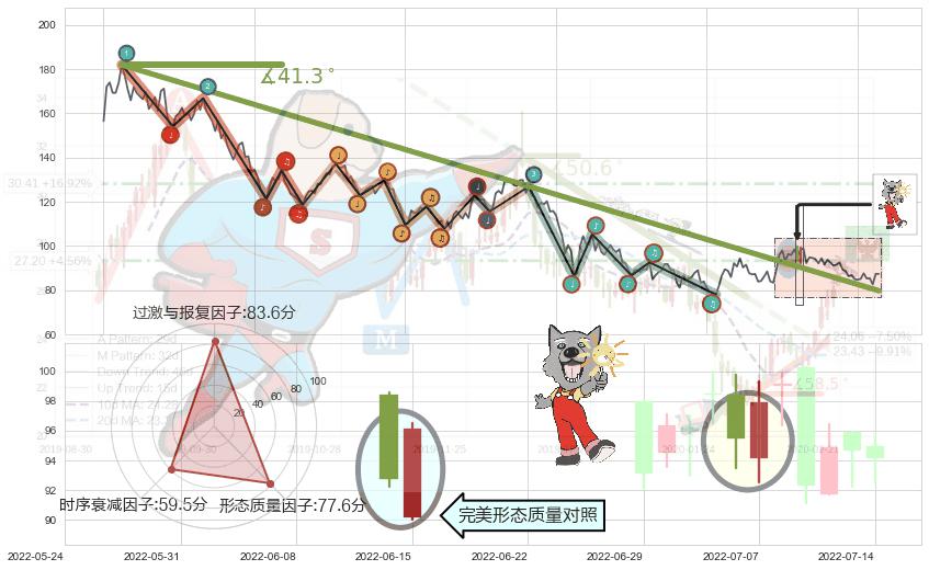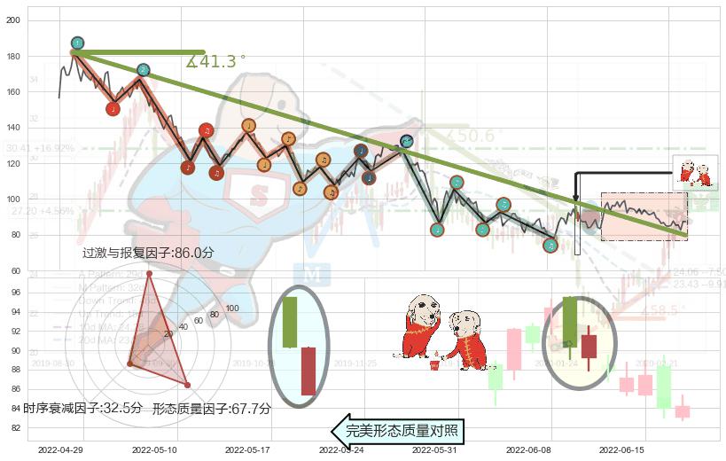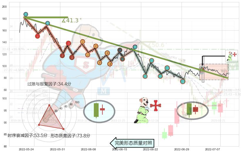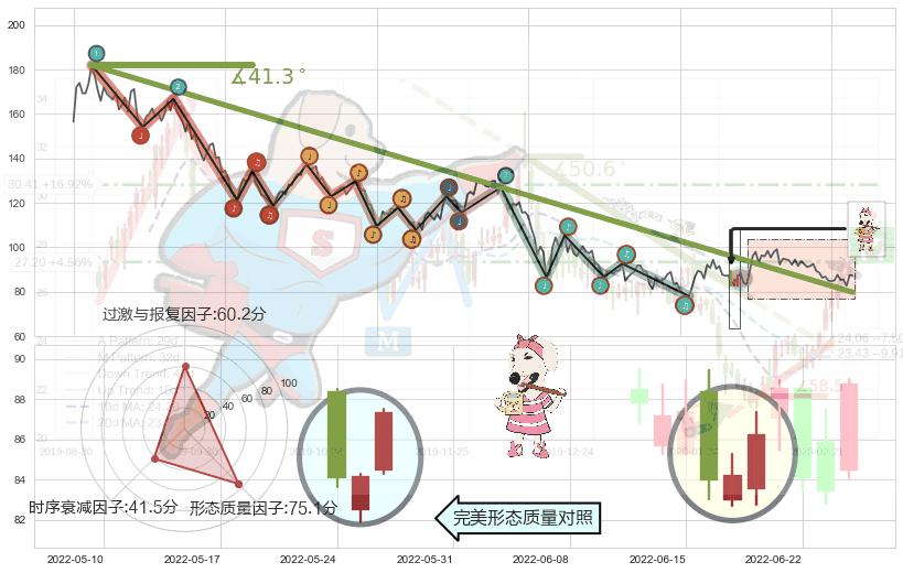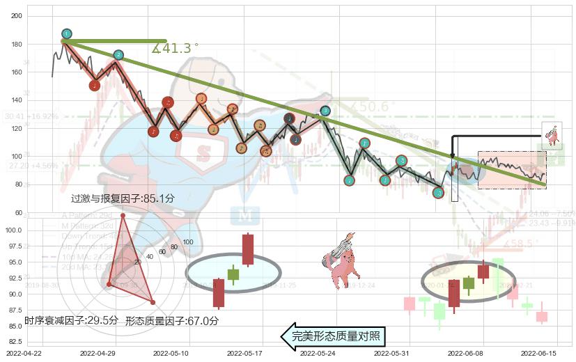 ➢ 2021-08-04-2022-06-07下跌趋势存在反转上涨[机会],虽然原下跌趋势的阻力位(79.83)已被突破,但其阻力效果尚存,原下跌趋势角度: 41.3˚