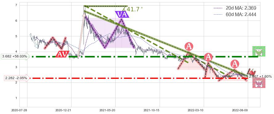 ♘ 阻力价格位3.682,可信任强度90.69%,距离最后交易2022-08-12形成的收盘价格2.330相差 +58.03%