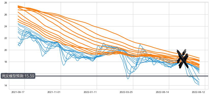 ➣ 70小时均线于(2022-07-12: 18.26)形成【死叉】基于【死叉历史模型】预测死叉后最低波谷价格: 15.14, 死叉后最低价格13.74,已经下跌超出预测最低波谷价格, 预期反弹